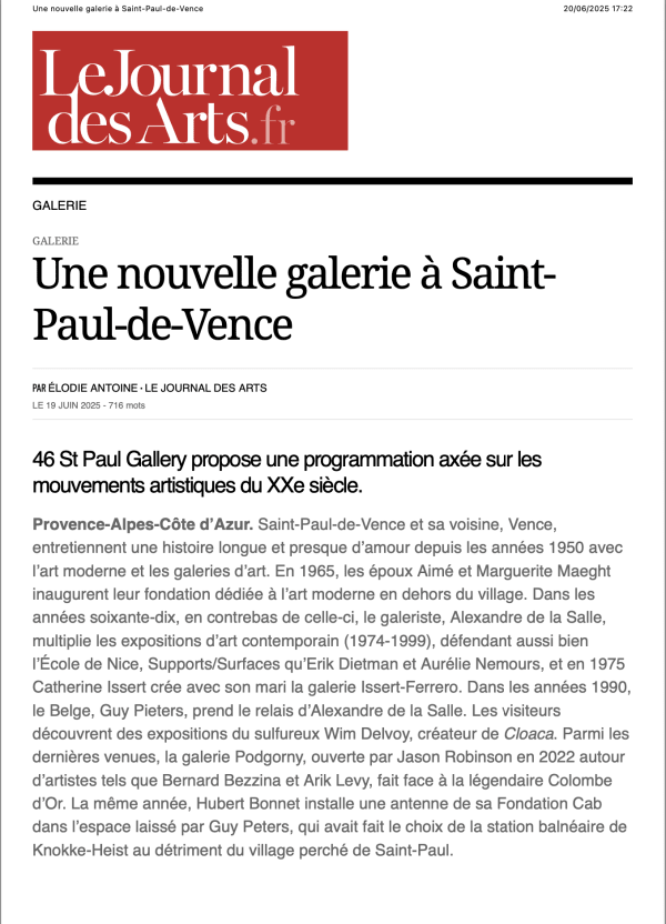 46 St Paul Gallery propose une programmation axée sur les mouvements artistiques du XXe siècle.Élodie Antoine, Le Journal des Arts, Juin 20, 2025 -